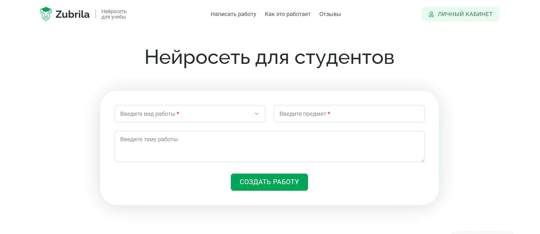 Функционал платформы выходит далеко за рамки простой генерации текста. Создан универсальный инструмент, который покрывает 90% потребностей современного учащегося. Зубрила обучен на миллионах академических текстов, учебников и научных статей. Владеет терминологией и стилистикой, необходимой для успешной сдачи работ.